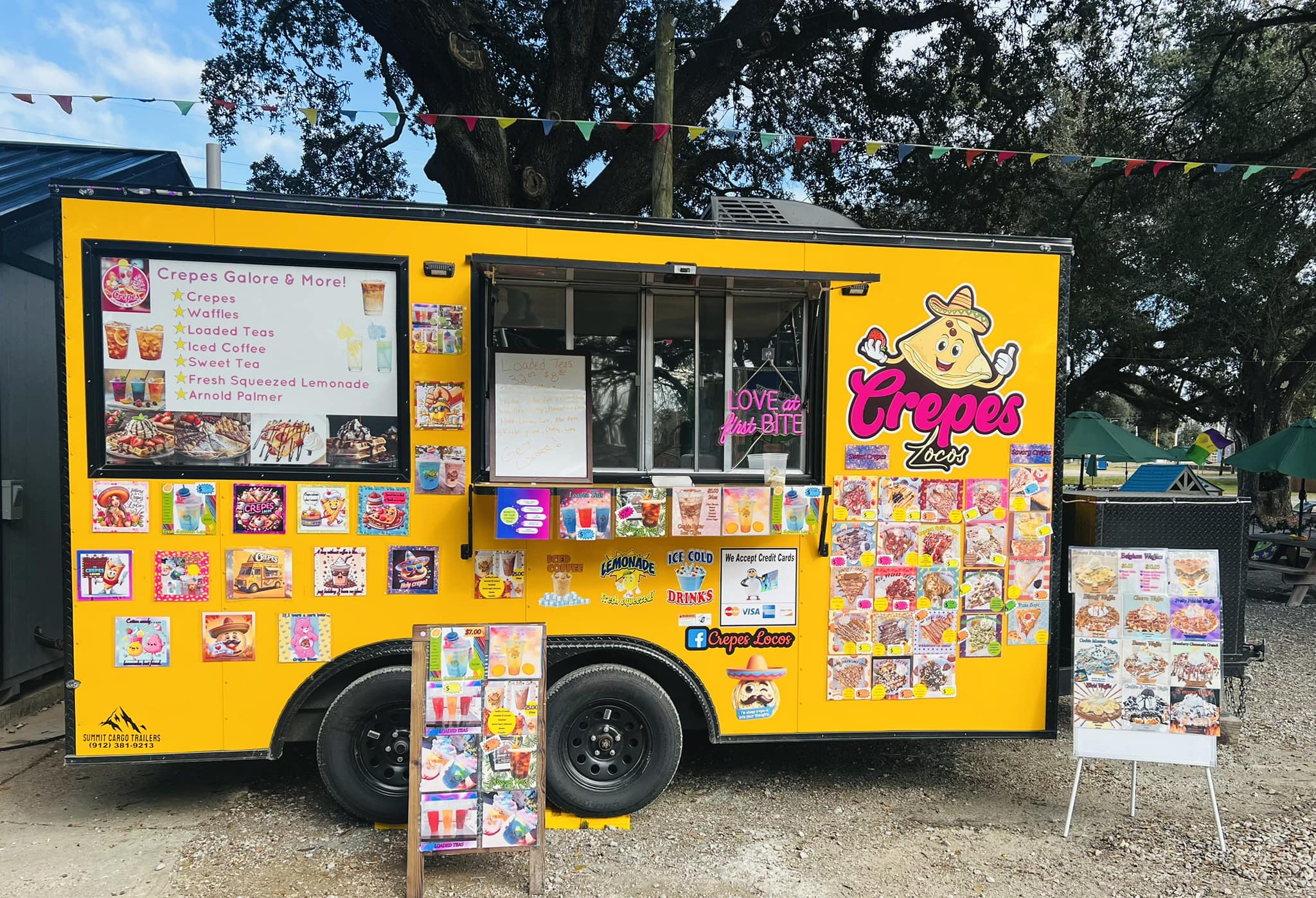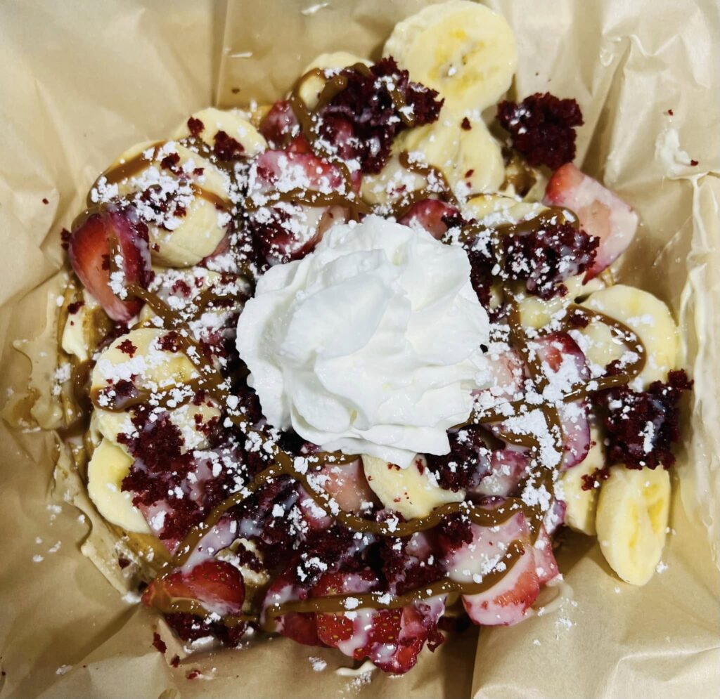 We have a wide variety of sweet crepes and waffles, a few savory options. Also beverages such as fresh squeezed lemonade, boba lemonade, iced coffee, loaded teas, sweet teas, etc.